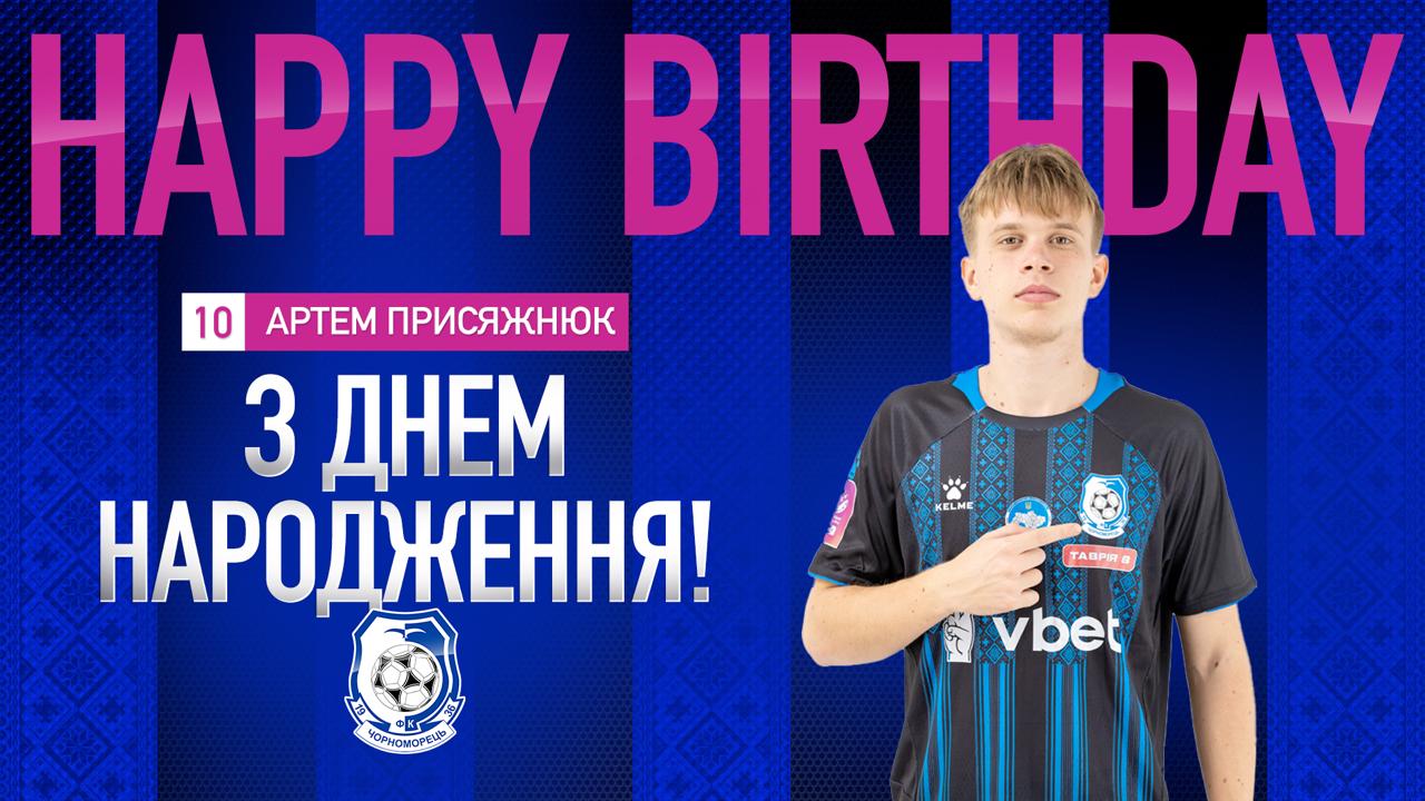 Сьогодні футболісту «Чорноморця» Артему ПРИСЯЖНЮКУ виповнюється 20 років. Колектив нашого клубу вітає юного «моряка» з днем народження, бажаємо міцного здоров'я, оптимізму, удачі та яскравої спортивної кар'єри!