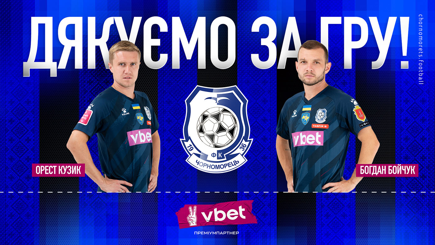 ФК «Чорноморець» припинив співробітництво з двома футболістами. Наш клуб залишають нападник Богдан БОЙЧУК та хавбек Орест КУЗИК. Бажаємо їм успішної подальшої кар’єри, яскравих матчів та дякуємо за гарний футбол у складі команди «моряків»!