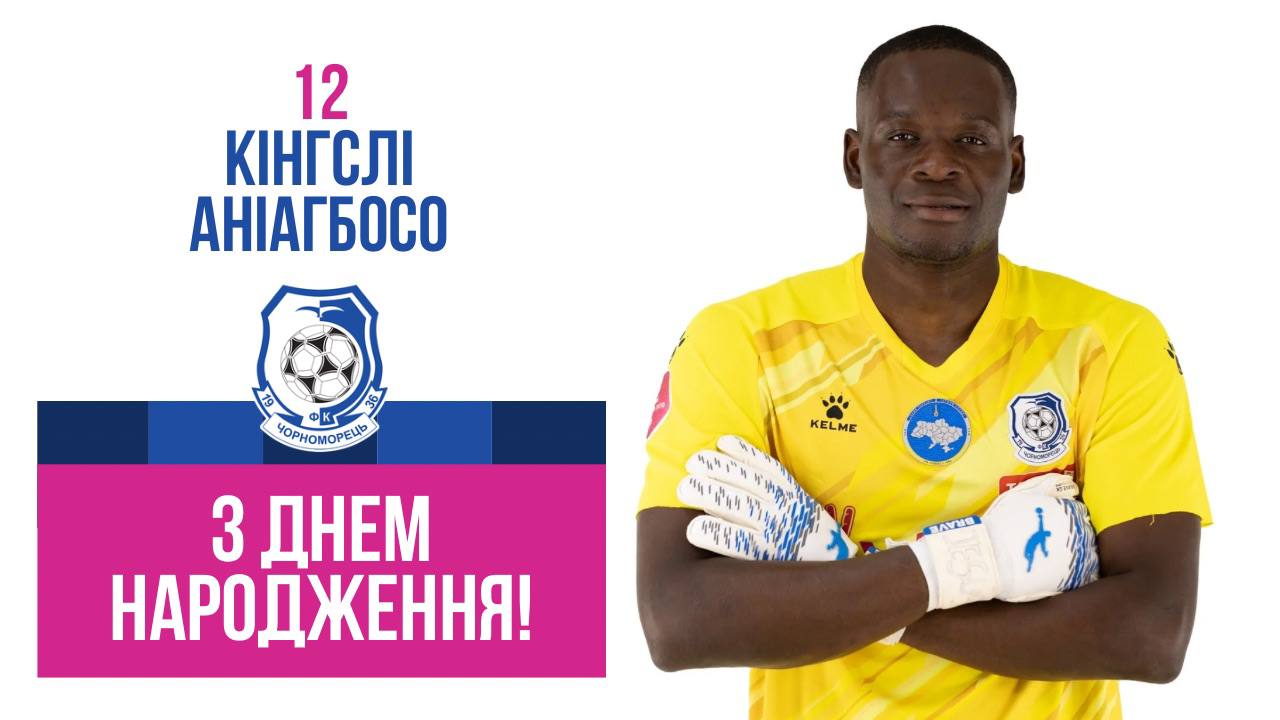 Сьогодні воротарю «Чорноморця» Чижиоці Кінгслі АНІАГБОСО виповнюється 22 роки. Колектив нашого футбольного клубу вітає «моряка» з днем народження, бажаємо міцного здоров’я, витримки, яскравих та «сухих» матчів, незмінної удачі та благополуччя!