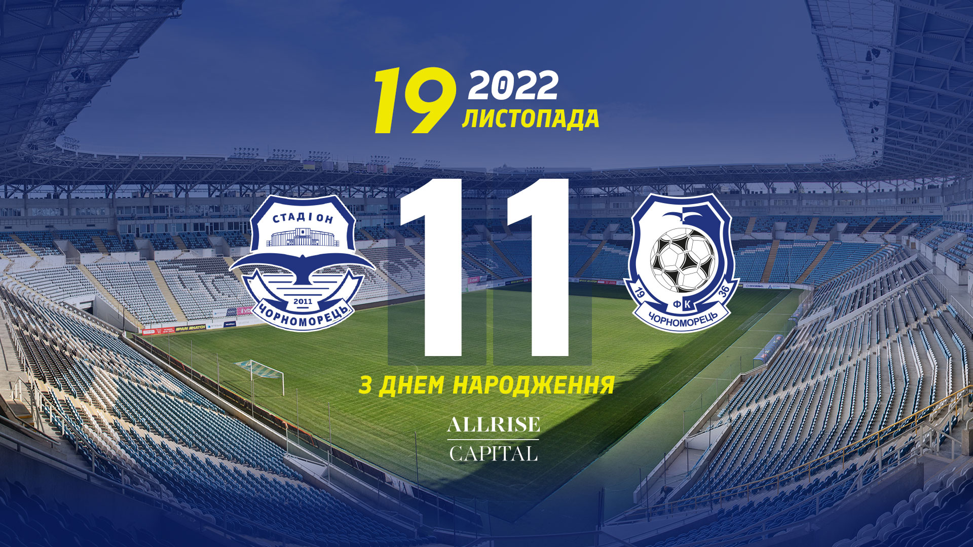 Футбольний клуб “Чорноморець” вітає з днем народженням і дякує за підтримку власникам стадіону компанії Allrise Capital, що на початку сезону 22/23 в УПЛ стала титульним партнером команди. Ми раді, що завдяки такій міцній опорі, можемо проводити домашні матчі саме тут. Впевнені, що завдяки захисникам України, наступний 12-й день народження арени “Чорноморець” ми будемо святкувати разом з нашим 12-м гравцем - найкращими і найвідданішими вболівальниками у світі.