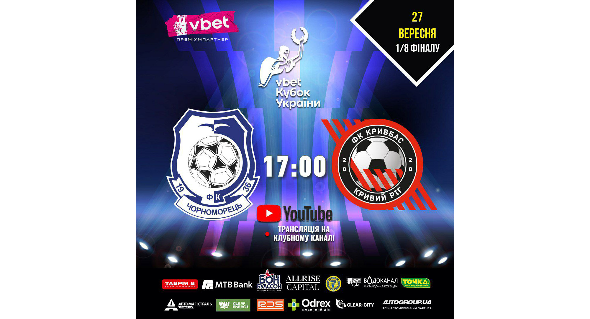В Одесу повертаються кубкові змагання! 27 вересня о 17-й годині "Чорноморець" продовжить свою ходу VBET Кубком України. В 1/16 підопічні Романа Григорчука здолали столичний "Лівий берег". Попереду - міцний і непоступливий "Кривбас", що наразі йде другим. Колектив Юрія Вернидуба проведе свою першу гру в турнірі.