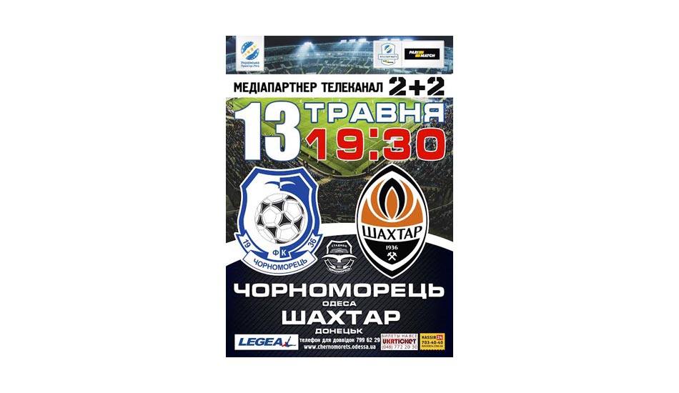 В пятницу, 5-го мая, начинается реализация билетов на матч 29-го тура Лиги Пари-Матч между командами «Черноморец» (Одесса) и «Шахтер» (Донецк), который состоится 13-го мая на стадионе нашего клуба (начало в 19:30).