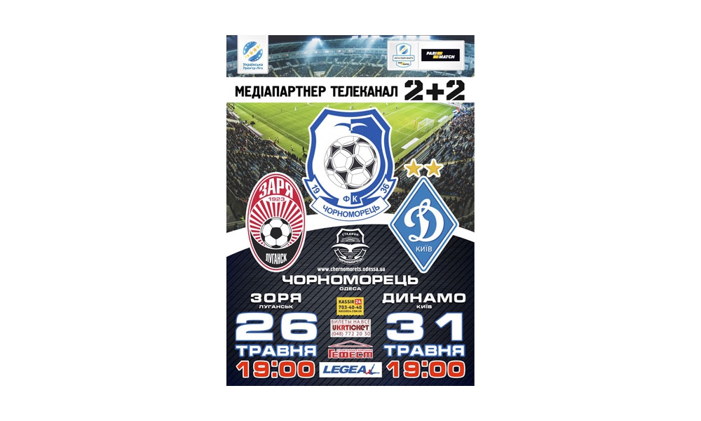 В четверг, 18-го мая, начинается реализация билетов на игры 31-го и 32-го туров Лиги Пари-Матч «Черноморец» - «Заря» (Луганск) и «Динамо» (Киев) - «Черноморец», которые состоятся в Одессе 26-го и 31-го мая, соответственно, на стадионе нашего клуба (начало обоих матчей в 19:00).