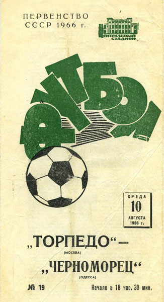1966 год — «Торпедо» Москва — «Черноморец» — 1:1 (1:1). Чемпионат СССР. Москва. Центральный стадион «Динамо». Голы: В. Москаленко (45) — В. Щербаков (27).