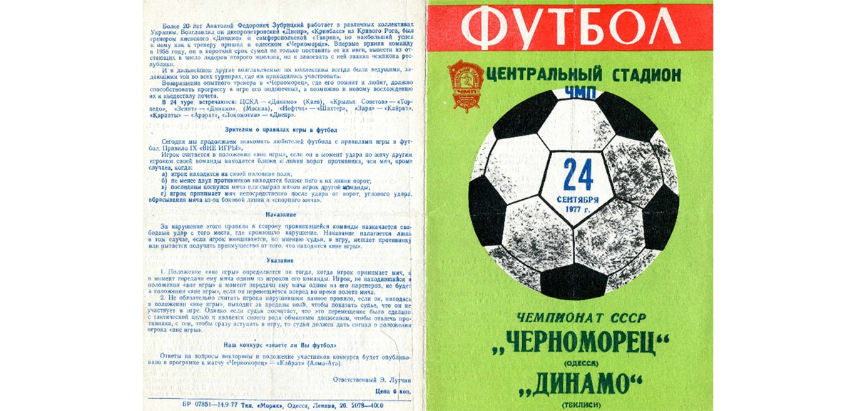 1977 год — «Черноморец» — «Динамо» Тбилиси — 2:1 (1:1). Чемпионат СССР. Одесса. Центральный стадион ЧМП. Голы: В. Шевченко (38), А. Погорелов (60) — В. Гуцаев (21).