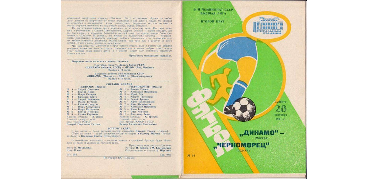 1991 год — «Динамо» Москва — «Черноморец» — 1:1 (0:0). Чемпионат СССР. Москва. Центральный стадион «Динамо». Голы: Ю. Сак (64) — В. Леоненко (84-пенальти).