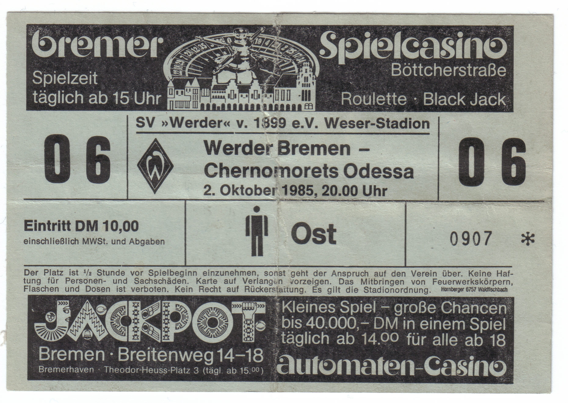 1985 год — «Вердер» (Бремен, Германия) — «Черноморец» - 3:2 (1:1). Кубок УЕФА. 1/32 финала (ответный матч). Бремен. «Везерштадион». Голы: В. Пасулько (25), О. Морозов (47) — М. Кутцоп (10), Б. Пеццай (49), Ф. Нойбарт (73). Удален: И. Савельев («Черноморец», 48).