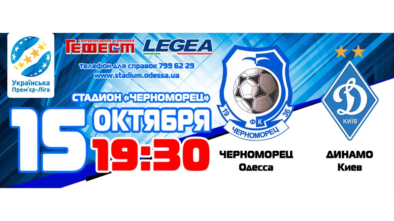 Началась реализация билетов на матч 12-го тура Чемпионата УПЛ между командами ФК «Черноморец» (Одесса) и ФК «Динамо» (Киев), который состоится 15-го октября 2017 года (начало в 19:30).