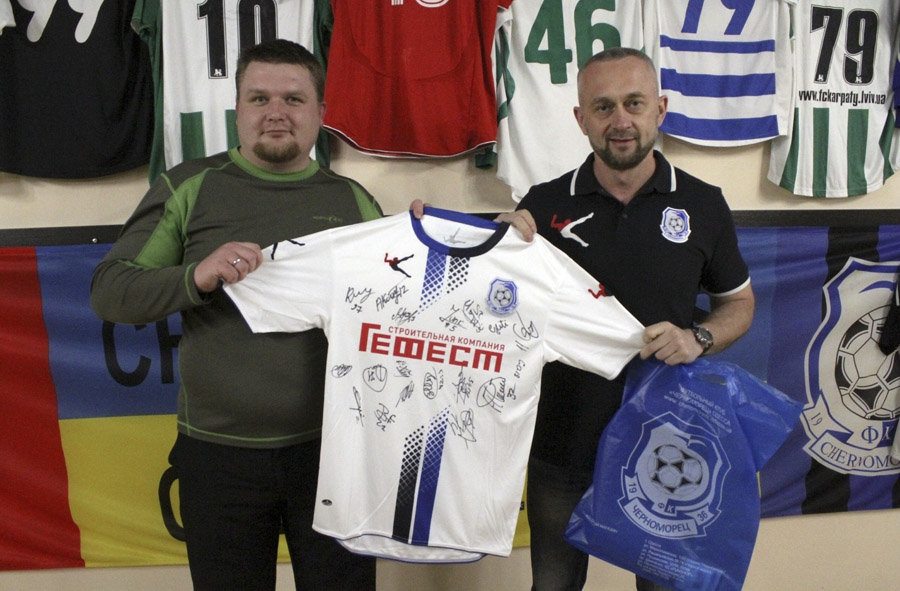 Артему Корчаку, автору слогана, признанного лучшим по итогам трех этапов конкурса, была вручена футболка «Черноморца» с автографами игроков.