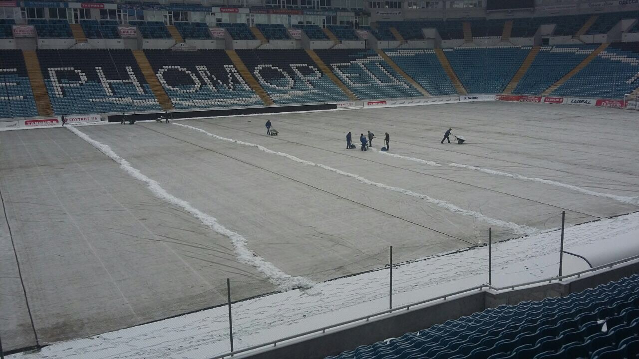 Главная спортивна арена Одессы готовится к проведению первого в 2018-м году футбольного матча. Даже сегодняшний ночной снегопад не застал врасплох работников стадиона «Черноморец». Заблаговременно был включен подогрев поля, а газон укрыт специальной агротканью. С раннего утра началась уборка снега. К субботнему поединку «Черноморец» - «Карпаты» (Львов), который начнется в 14-00, футбольное поле будет готово на все 100 процентов.