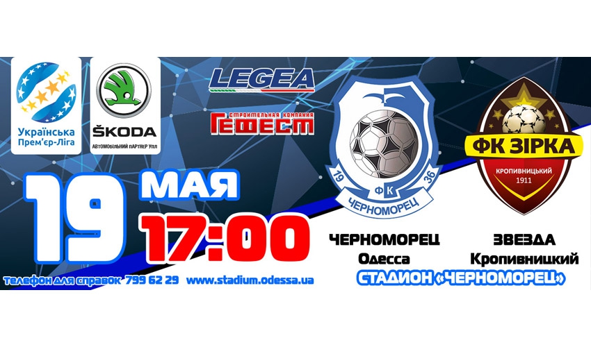 Началась реализация билетов на матч 32-го тура Чемпионата УПЛ между командами ФК «Черноморец» (Одесса) и ФК «Звезда» (Кропивницкий), который состоится 19-го мая (начало в 17:00).