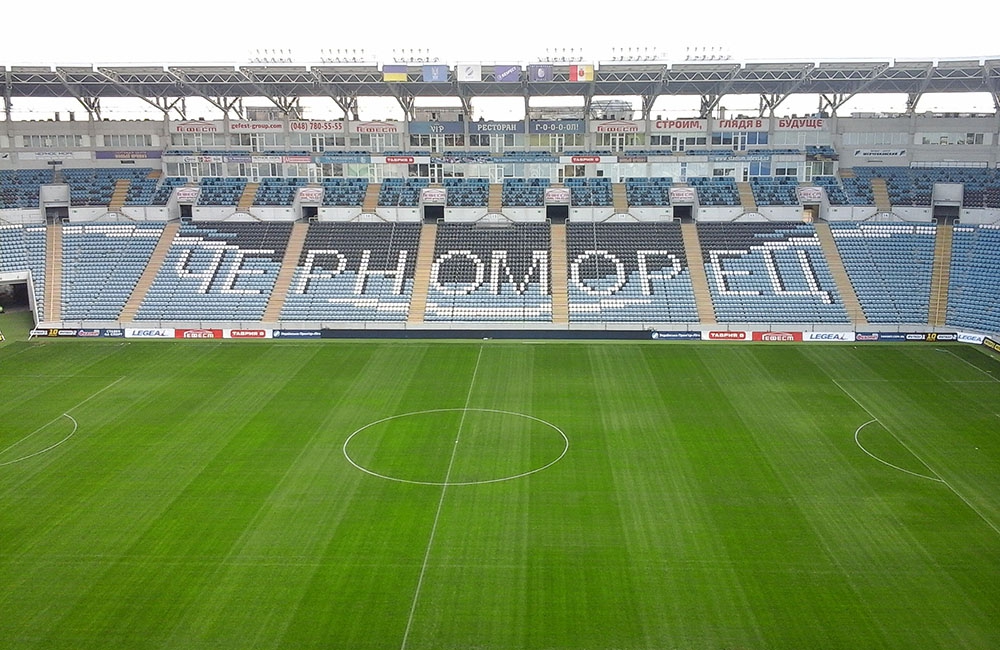 Футбольный газон стадиона «Черноморец» выглядит отлично и полностью готов к вечернему поединку.