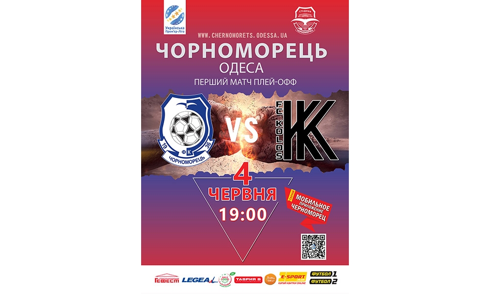 Сегодня началась реализация билетов на первый переходной матч плей-офф между командами ФК «Черноморец» (Одесса) и ФК «Колос» (Ковалевка), который состоится 4 июня 2019 года (начало в 19:00).