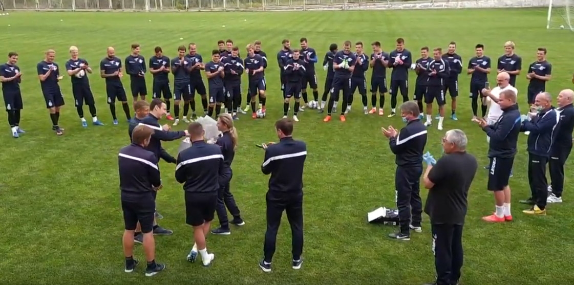 После двух дней выходных сегодня «моряки» возобновили тренировочную работу. Перед началом занятия наша команда поздравила с днем рождения тренера Викторию Самар.