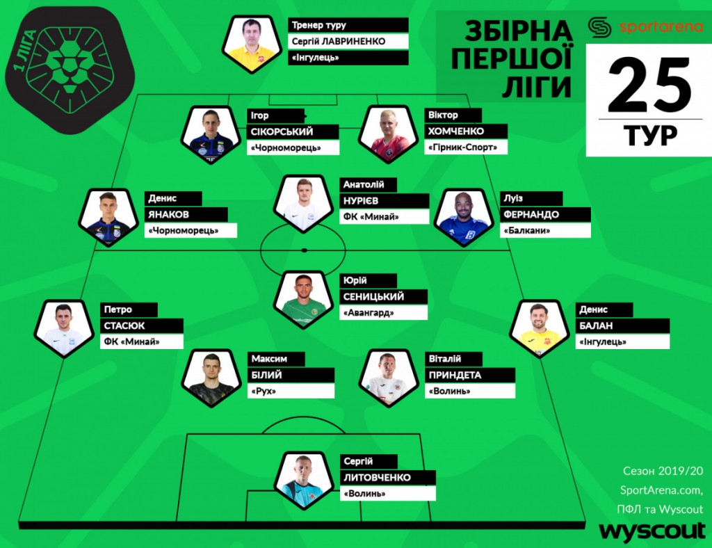 По итогам 25 тура чемпионата первой лиги SportArena в сотрудничестве с компанией Wyscout назвала символическую сборную. В число 11 лучших футболистов попали два игрока «Черноморца»: Игорь СИКОРСКИЙ и Денис ЯНАКОВ, который к тому же признан героем тура.