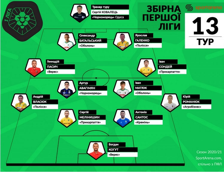 SportArena определила лауреатов 13 тура чемпионата Украины среди команд первой лиги. Лучшим тренером признан наставник «Черноморца» Сергей КОВАЛЕЦ, в символическую сборную вошел полузащитник «моряков» Артур АВАГИМЯН, чей мяч в ворота «Металлиста-1925» стал «Голом тура».