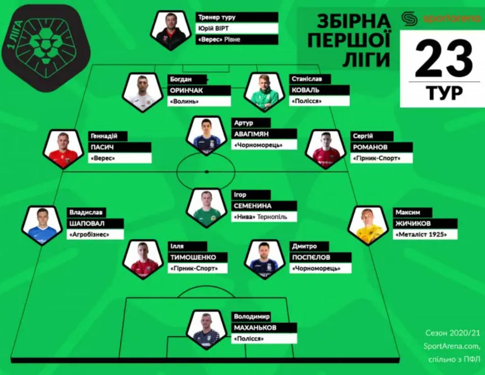 Sportarena определила лауреатов 23 тура чемпионата Украины среди команд первой лиги. В символическую сборную вошли два футболиста «Черноморца»: центральный защитник Дмитрий ПОСПЕЛОВ и полузащитник Артур АВАГИМЯН. Кроме того, лучшим молодым игроком тура (во второй раз) признан нападающий «моряков» Даниил СУХОРУЧКО.