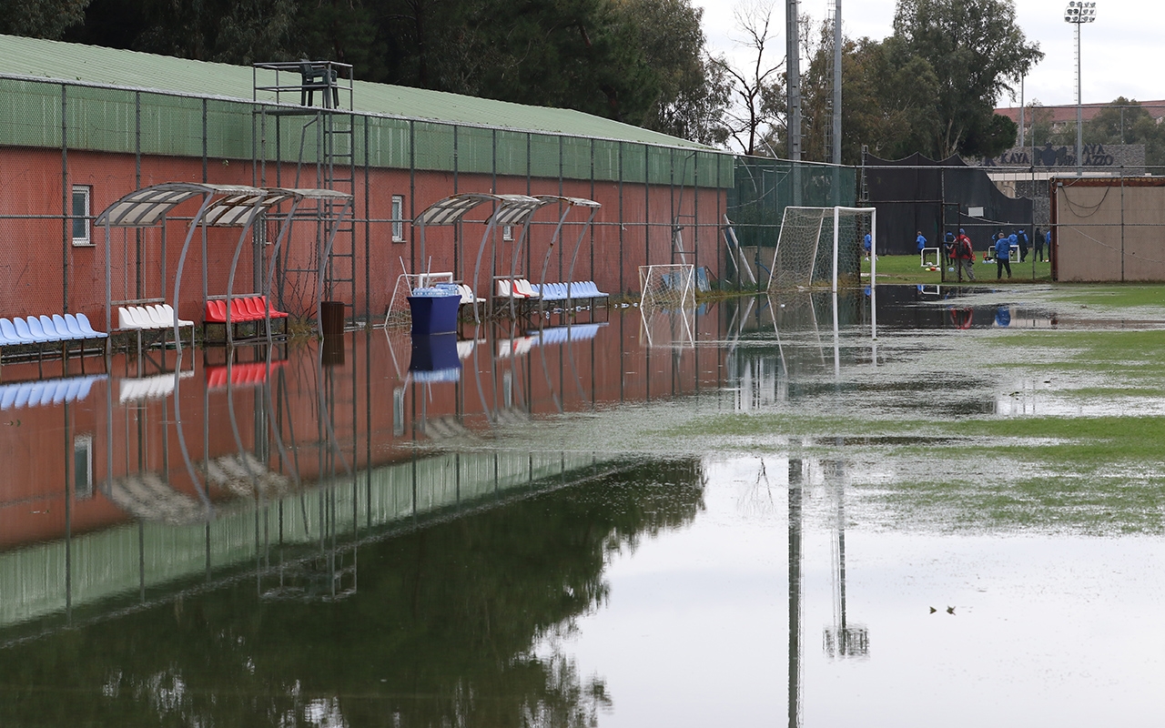 Двухдневная непогода на турецком средиземноморье внесла коррективы в работу «Черноморца». Так сегодня «морякам» пришлось отказаться от занятия на «своем» футбольном поле, которое было буквально залито ливнями, и передислоцироваться на соседнюю травяную площадку меньших размеров. Впрочем, на интенсивность тренировочного процесса этот переход не повлиял. Фото – Александра Лесика.