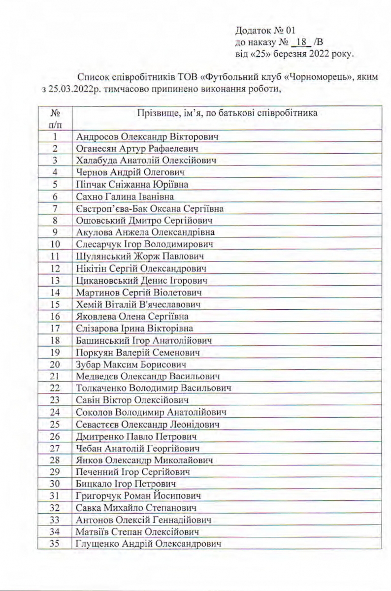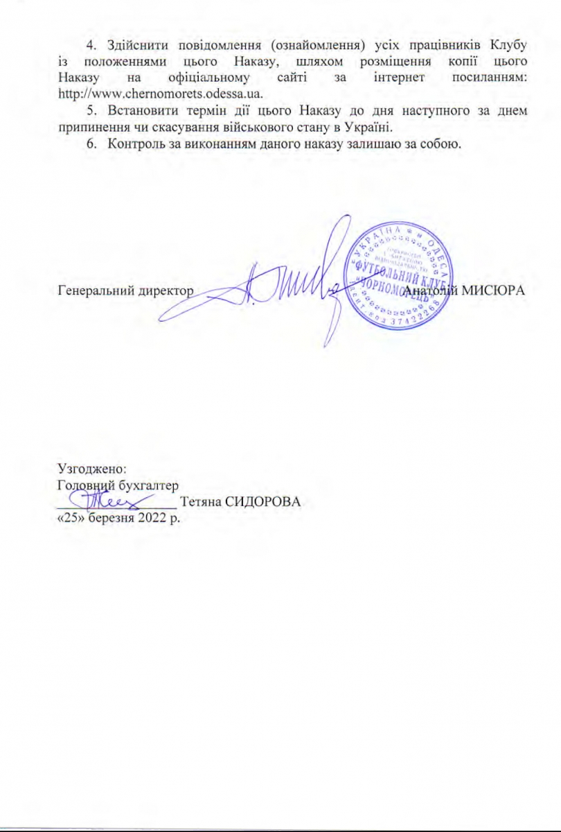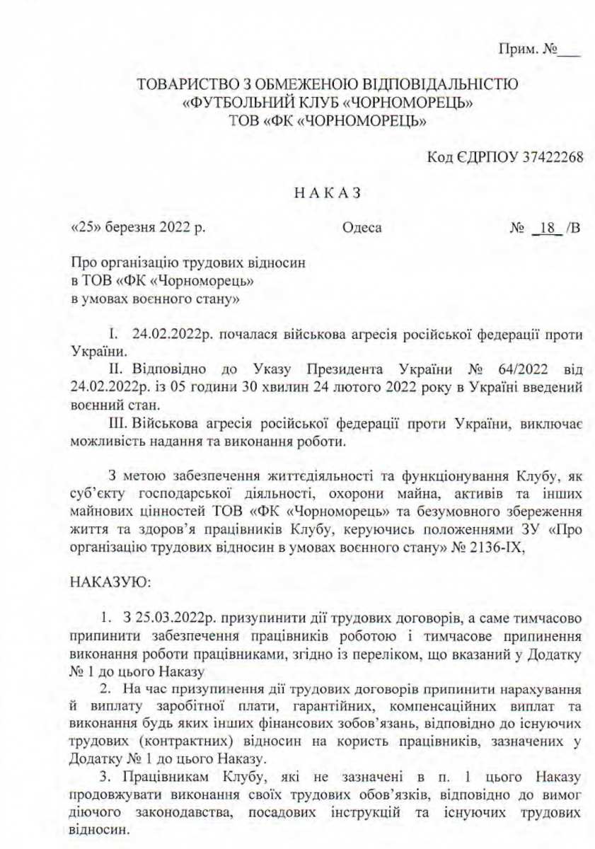 Наказ №18/В від 25 березня 2022 року про організацію трудових відносин в ТОВ «ФК «Чорноморець» в умовах воєнного стану:
