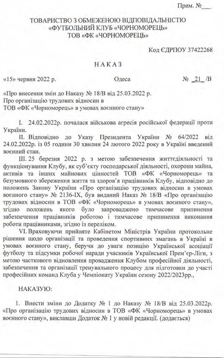 Наказ № 21/В від 15 червня 2022 року про внесення змін до наказу № 18/В від 25.03.2022 р. "Про організацію трудових відносин в ТОВ «ФК «Чорноморець» в умовах воєнного стану":