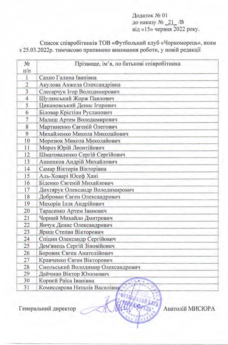 До уваги працівників ФК «Чорноморець»!