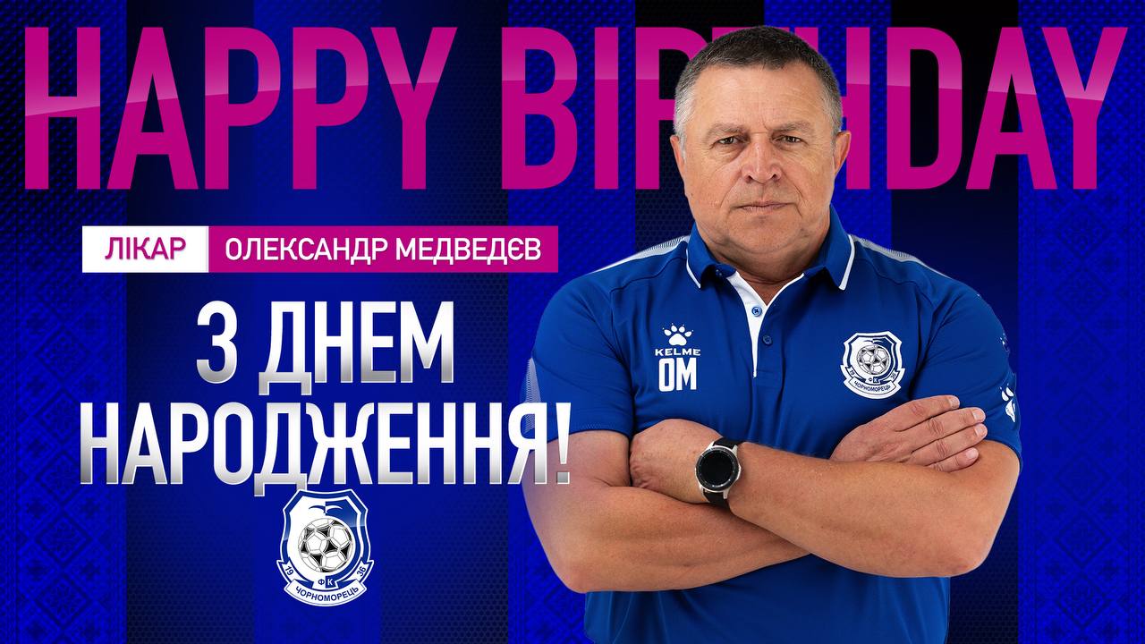 Сьогодні старшому лікарю медичної служби ФК «Чорноморець» Олександру МЕДВЕДЄВУ виповнюється 62 роки. Колектив нашого клубу щиро вітає Олександра Васильовича з днем народження та бажає йому чудового здоров'я, удачі, благополуччя, натхнення та виконання всього задуманого!
