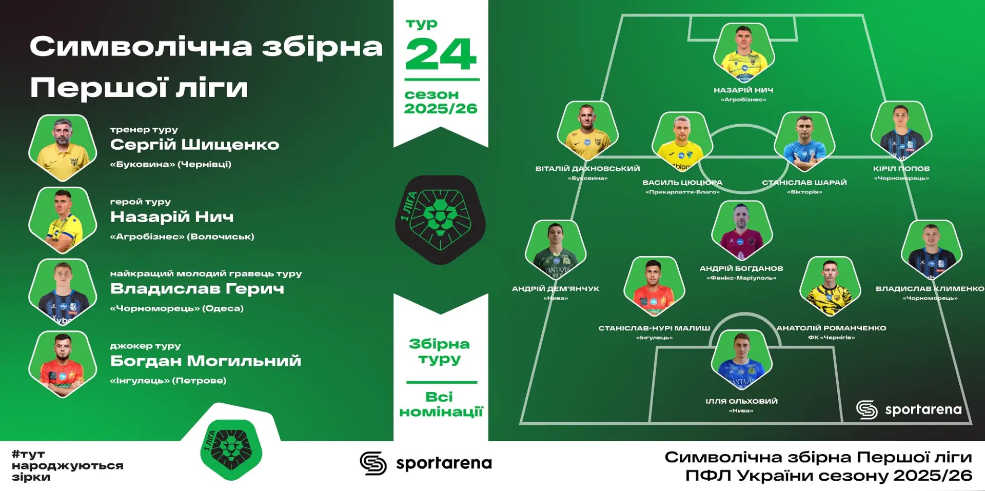 Медіа-партнер ПФЛ України видання «SportArena» визначило лауреатів 24 туру VBET першої ліги сезону 2025/26. До символічної збірної увійшли футболісти «Чорноморця» Владислав КЛИМЕНКО та Кіріл ПОПОВ, а Владислава ГЕРИЧА визнано найкращим молодим гравцем туру.