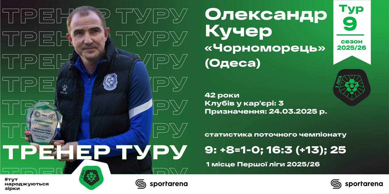 Медіа-партнер ПФЛ України видання «SportArena» визначило лауреатів 9 туру VBET першої ліги сезону 2025/26. Кращим тренером визнано Олександра КУЧЕРА. До символічної збірної туру увійшли футболісти «Чорноморця» Ярослав РИКІЦЬКИЙ та Віталій ЄРМАКОВ, чий забитий м’яч у ворота «Пробія» став «Голом туру».