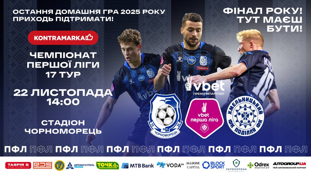 22 листопада в Одесі відбудеться матч 17 туру чемпіонату України VBET Перша ліга. «Чорноморець» буде приймати «Поділля» (Хмельницький). Гра почнеться о 14-00.