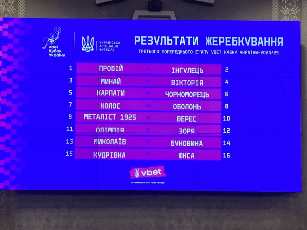 Сьогодні в Будинку футболу відбулося жеребкування третього попереднього раунду VBET Кубку України сезону-2024/2025. У ньому взяли участь 16 команд – 9 переможців другого етапу та сім клубів УПЛ із найнижчим рейтингом за результатами минулого сезону:
