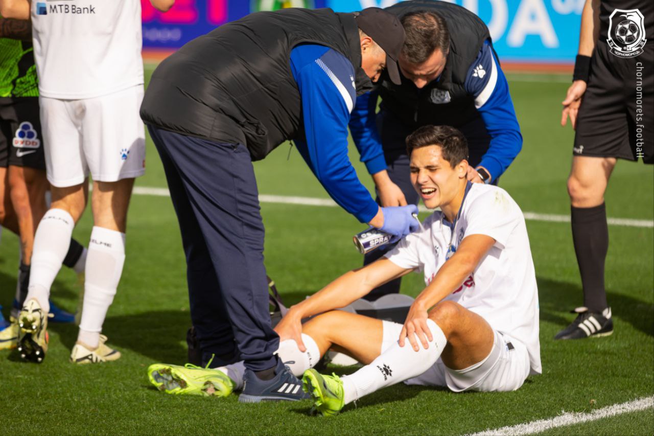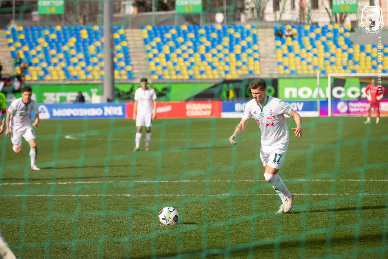«Моряки» сковано розпочали гру, і це дуже швидко позначилося на результаті. На 5 хвилині після прострілу Крушинського м'яч від Лацабідзе влучив у стійку, потім відлетів від Рудька до Бітона, який повернув «снаряд» у воротарський майданчик на неприкритого Батісту – 0:1. Моменти біля наших воріт виникали регулярно. Рудько відбив «постріл» Гуцуляка на 13 хвилині, на 15-й виграв очну дуель у Крушинського. На 27 хвилині Бітон із 5 метрів головою послав м'яч над поперечиною. Наприкінці тайму «Полісся» подвоїло перевагу: Рудько відбив потужний удар Батісти, а Андрієвський був першим на добиванні – 0:2.