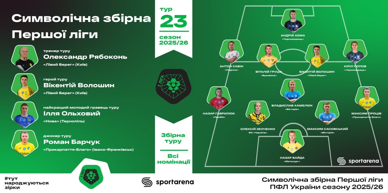 Медіа-партнер ПФЛ України видання «SportArena» визначило лауреатів 23 туру VBET першої ліги сезону 2025/26. До символічної збірної увійшли футболісти «Чорноморця» Кіріл ПОПОВ та Андрій ХОМА.