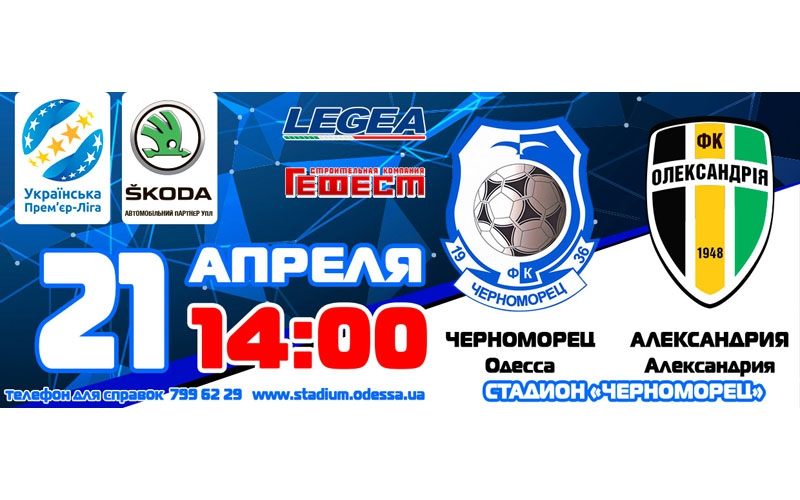 Сегодня начинается реализация билетов на матч 28-го тура чемпионата УПЛ между командами ФК «Черноморец» (Одесса) и ФК «Александрия», который состоится 21-го апреля 2018 года (начало в 14:00).