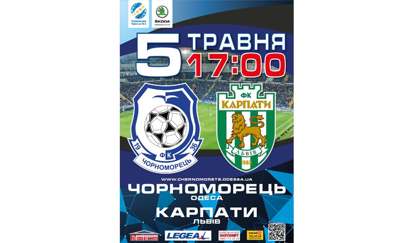 Сегодня, 25 апреля, началась реализация билетов на матч 30-го тура чемпионата УПЛ между командами ФК «Черноморец» (Одесса) – ФК «Карпаты» (Львов), который состоится 5 мая 2018 года (начало в 17:00).