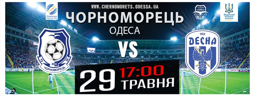 Началась реализация билетов на матч 32-го тура чемпионата УПЛ между командами ФК «Черноморец» (Одесса) и ФК «Десна» (Чернигов), который состоится 29-го мая (начало в 17:00).