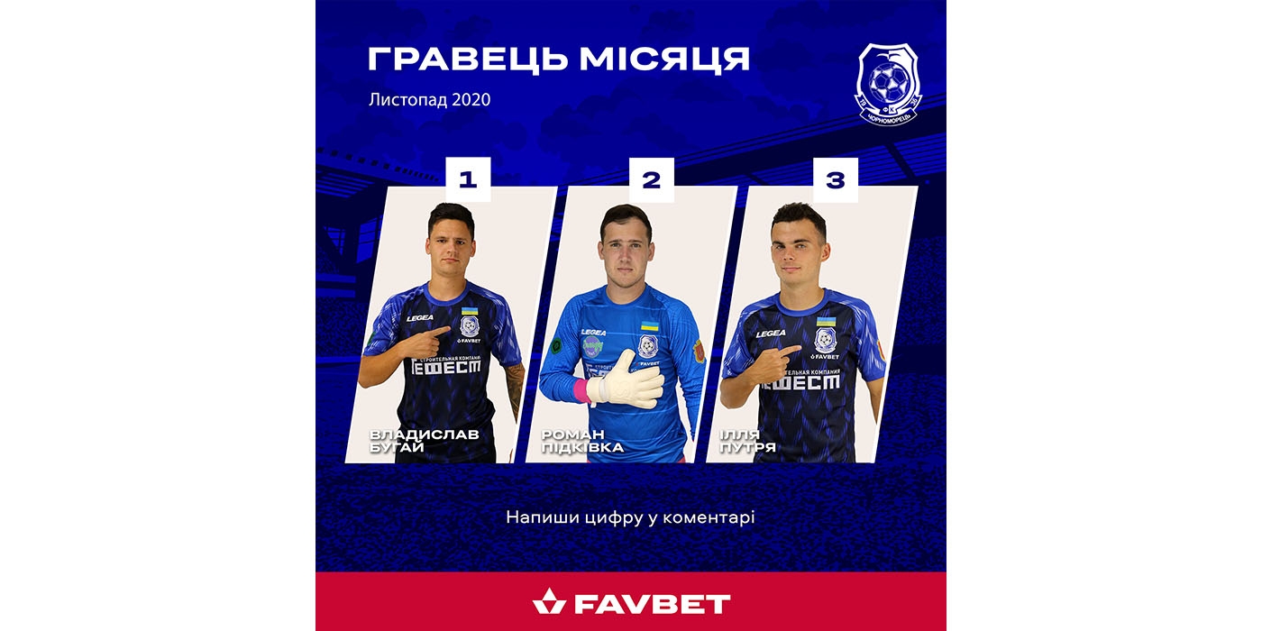 Компания «Favbet», которая является партнером ФК «Черноморец», учредила призы для лучших футболистов команды «моряков» в каждом месяце. В ноябре по мнению экспертов первые три позиции заняли Владислав БУГАЙ, Роман ПИДКИВКА и Илья ПУТРЯ.