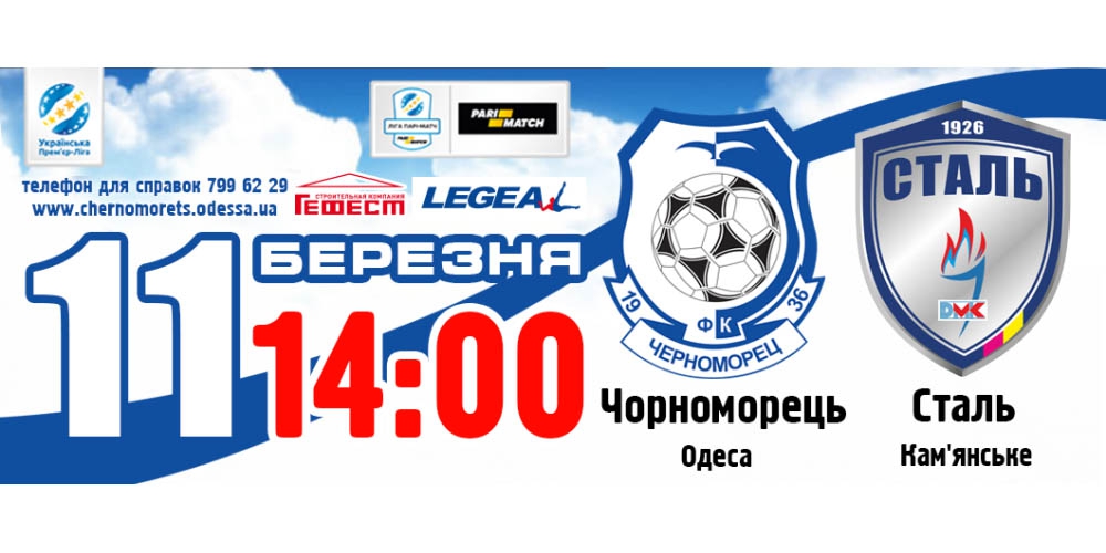 4-го марта начинается реализация билетов на игру 21-го тура Лиги Пари-Матч между командами «Черноморец» (Одесса) и «Сталь» (Каменское), которая состоится 11 марта (начало в 14:00).