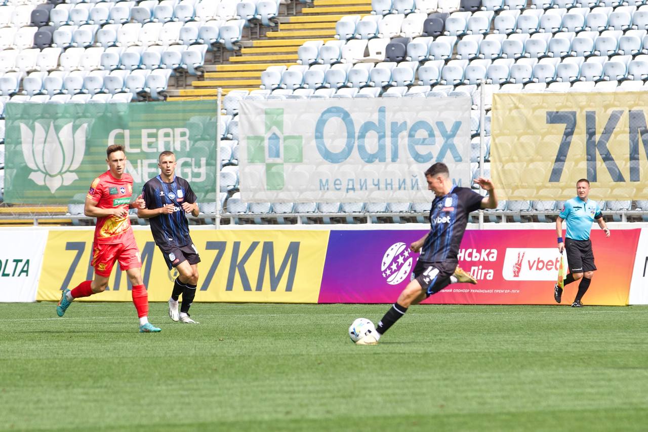 У першому таймі обидві команди рідко загрожували воротам суперника. Найяскравіший момент виник на 26 хвилині. «Моряк» Попов випередив Шершня і пробив з 10 метрів прямо в Паламарчука, який кинувся назустріч. У компенсований час Скиба після кутового зблизька головою послав м'яч вище воріт.