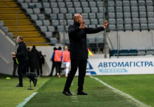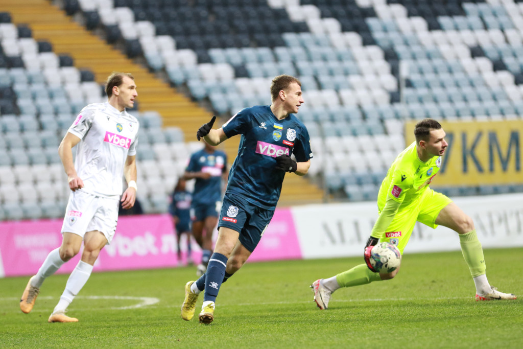 Через повітряну тривогу початок матчу змістився на 38 хвилин. Перший тайм пройшов у виснажливій позиційній боротьбі. Ударів по цілі було дуже мало, як і роботи в голкіперів. Двічі м'яч дійшов до Варакути і обидва рази наш сторож воріт зіграв надійно: на 2 хвилині взяв м'яч після «стандарту» з 20 метрів у виконанні Бойка, а на 39-й без проблем нейтралізував удар Пасіча з-за меж штрафного майданчика. Набагато небезпечніше було на 31 хвилині, коли Васильєв прийняв на себе постріл Калюжного з середньої дистанції. Найяскравіший момент біля протилежних воріт виник на 38 хвилині: Бадібанга отримав своєчасну передачу від Кузика, але пробив із 12 метрів поряд зі стійкою.
